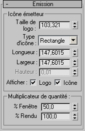 Ce groupe de fonctions permet de définir les caractéristiques physiques de l'icône émetteur (source de particule), ainsi que le pourcentage de particules produites dans les fenêtres et lors du rendu.