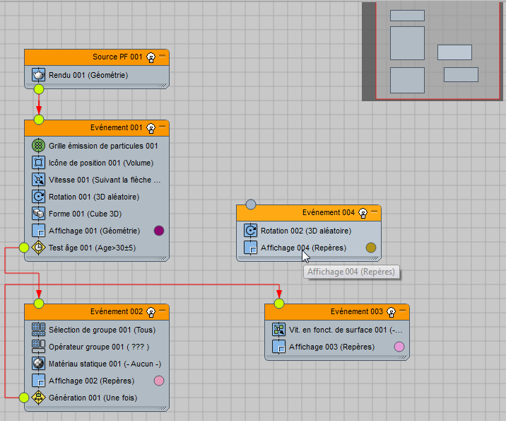 Dans le réseau de flux de particules présenté ci-dessus, toutes les particules de l'événement 01 qui ont passé le test d'âge sont dirigées vers l'événement 02, mais seules celles sélectionnées par l'opérateur Sélection de groupe dans l'événement 02 utiliseront des opérateurs dans l'événement de rotation. Ensuite, toutes les particules qui sont passées à l'événement 02 (y compris les particules sélectionnées par l'opérateur Sélection de groupe et celles qui ne sont pas sélectionnées) sont dirigées vers l'événement 03 via le test de génération.