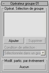 L'Opérateur groupe applique un événement complet aux particules indiquées par un ou plusieurs Opérateurs Sélection de groupe. L'Opérateur groupe est utile quand vous voulez appliquer un événement à un sous-ensemble de particules sans les séparer de l'événement en cours. Cela n'a une incidence sur les particules sélectionnées que lorsqu'elles restent dans l'événement en cours.