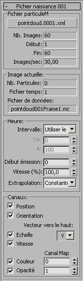 Cette zone contient un bouton qui affiche le nom du fichier de nuages de points au format XML qui définit les paramètres d'origine des particules. Pour sélectionner un autre fichier, cliquez sur le bouton, puis utilisez la boîte de dialogue de sélection de fichier qui apparaît. Cette zone contient également des données de base, en lecture seule, sur le fichier de particules, notamment le nombre total d'images, les heures de début et de fin, et la fréquence d'images de l'animation.