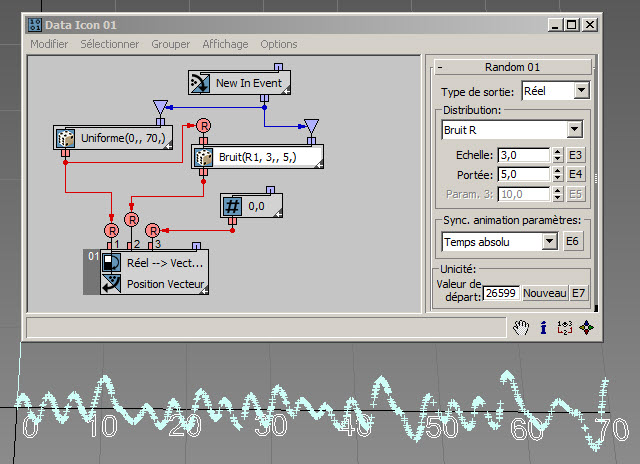 Cet exemple ( RandomTemplate07.max ) utilise la coordonnée X aléatoire d'une particule pour générer des valeurs aléatoires de type bruit pour la coordonnée Y :