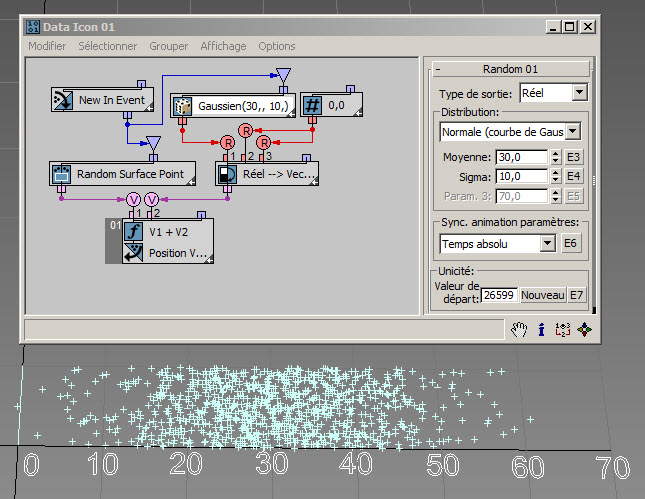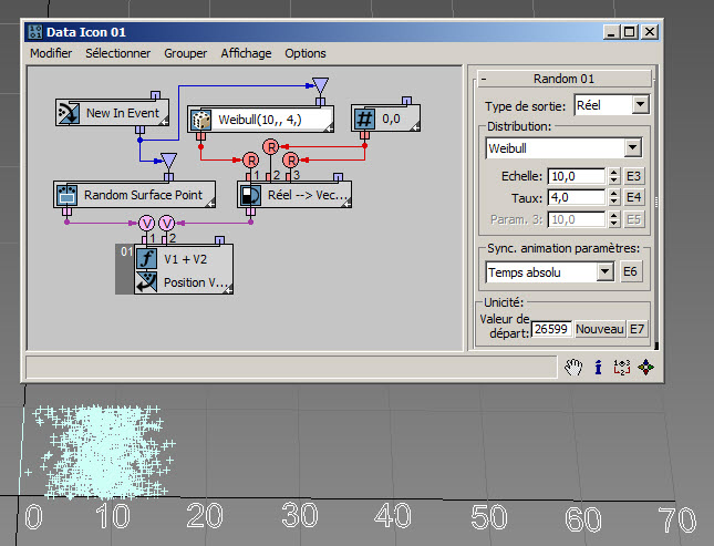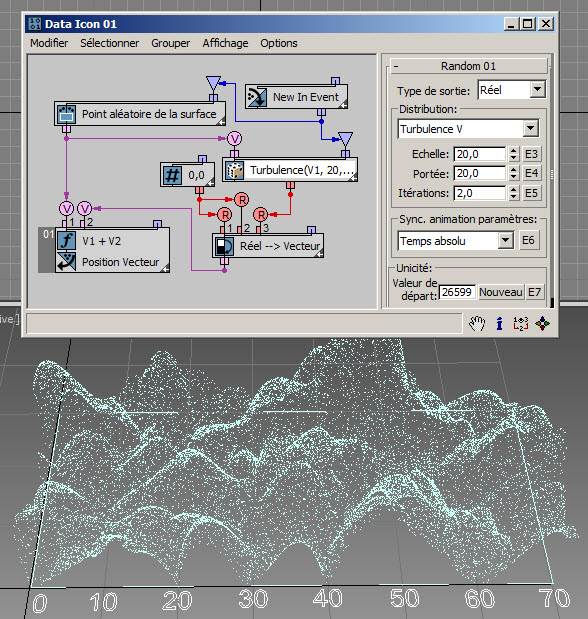 Dans l'exemple suivant ( RandomTemplate08.max ), les particules sont placées de manière aléatoire sur la surface de l'icône de l'opérateur de données, puis la position est utilisée comme entrée du sous-opérateur Aléatoire avec l'option Bruit V. Les données de sortie sont utilisées pour définir la hauteur des particules (axe Z).