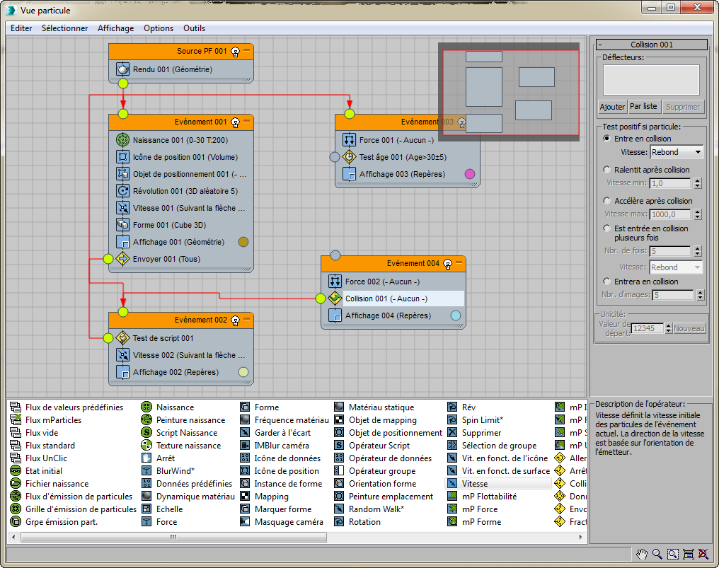 Vue particule est l'interface utilisateur principale pour créer et modifier des systèmes de particules dans Particle Flow. La fenêtre principale (l'affichage des événements) contient le diagramme des particules, qui décrit le système de particules. Un système de particules consiste en un ou plusieurs événements reliés, chacun contenant une liste composée d'un ou de plusieurs opérateurs et tests . Les opérateurs et les tests sont regroupés sous le terme d'actions.