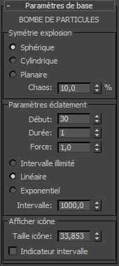 Affiche une sphère en mode filaire qui indique le niveau d'influence de la bombe à particules. Si vous avez sélectionné Intervalle illimité, cette option n'a aucun effet.