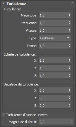 - Affiche le panneau déroulant Turbulence qui applique un bruit aléatoire et une turbulence sans divergence aux vélocités des particules.