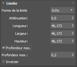 Limite les effets du champ de mouvement sur une couche de la profondeur spécifiée, en dessous de la surface du volume de fluide (pour appliquer une résistance uniquement au niveau de la surface d'une eau en déplacement rapide, ou près de celle-ci, par exemple). Notez que vous pouvez définir cette option même si l'option Limite n'est pas activée.