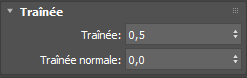- Affiche le panneau déroulant Traînée qui applique une force simulant une résistance, dans le but de rapprocher progressivement les vélocités des particules de celle du champ, ce qui provoque un effet similaire au vent. Cette option accélère les particules dont la vitesse de déplacement est inférieure à la vélocité du champ et ralentit les particules dont la vitesse de déplacement est supérieure, contrairement aux autres options qui accélèrent toujours les particules.