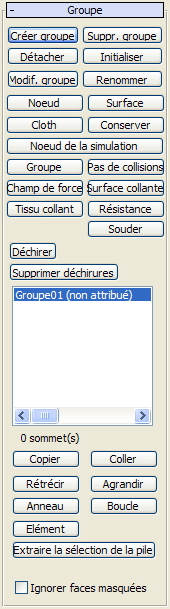 Le panneau déroulant du sous-objet Group sert à sélectionner des groupes de sommets et à restreindre leur placement aux surfaces, objets collision ou autres objets tissu.