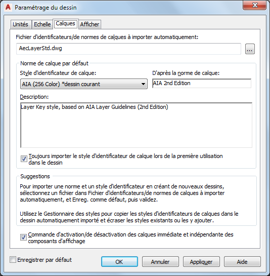 - Styles d'identificateurs de calques et normes de calques : bien qu'ils puissent être stockés dans un gabarit, il est conseillé de les conserver dans un dessin de bibliothèque et de vérifier, dans la boîte de dialogue Paramètres du dessin, que le style d'identificateur de calque le plus récent est automatiquement importé dans un nouveau dessin, ainsi que tous les dessins en cours d'utilisation lors son ouverture. Ainsi, vous vous assurez de toujours travailler avec la version la plus récente.