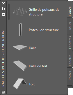 La palette d'outils Conception contient des exemples d'outils de dalle et de dalle de toit que vous pouvez utiliser et personnaliser en fonction de vos besoins. Les palettes personnalisées créées par votre gestionnaire CAO ou d'autres utilisateurs peuvent également contenir des outils de dalles ou de dalles de toit avec des propriétés et des styles personnalisés en fonction de vos projets ou de vos normes professionnelles.