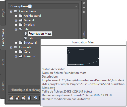 Dans le Navigateur du projet, vous pouvez afficher les aperçus miniatures des dessins du projet. Vous avez le choix entre un aperçu graphique ou détaillé, ou les deux à la fois. L'affichage des miniatures facilite la navigation dans les projets volumineux, constitués de nombreux dessins.