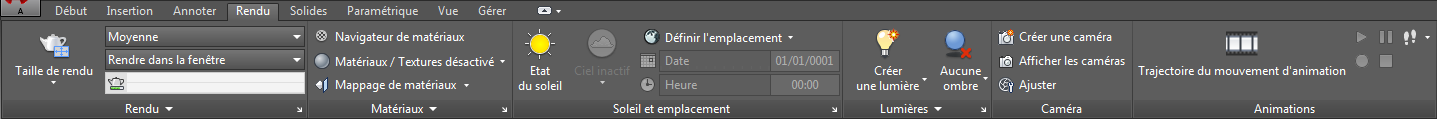 - Rendu. Contient les commandes permettant de créer le rendu de tout ou partie d'un objet, de générer un fichier de sortie du rendu et d'ouvrir la palette Paramètres avancés du rendu.