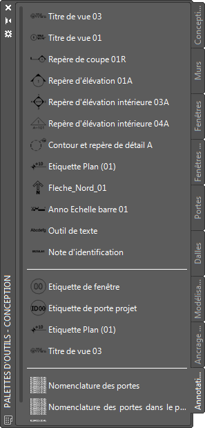 Les palettes personnalisées créées par votre gestionnaire CAO ou d'autres utilisateurs peuvent également contenir des outils d'étiquettes d'élévation avec définitions de blocs à vues multiples ainsi que des propriétés personnalisées en fonction de vos projets ou de vos normes professionnelles.