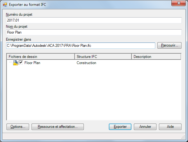 3. Dans la boîte de dialogue Exporter au format IFC, spécifiez les propriétés suivantes :