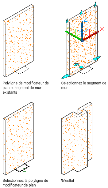 Cette procédure permet de créer un modificateur de mur à partir d'une polyligne ouverte. Vous pouvez tracer la polyligne à l'emplacement du modificateur de mur ou projeter le modificateur créé sur le mur. La polyligne ne peut pas être fermée.