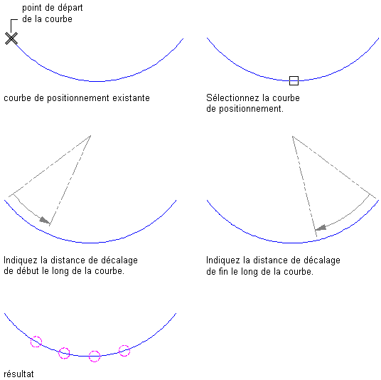 espacer un nombre de noeuds fixe le long de la courbe. tapez e (Espacer régulièrement). Indiquez les décalages de début et de fin des premier et dernier noeuds et spécifiez le nombre de noeuds.