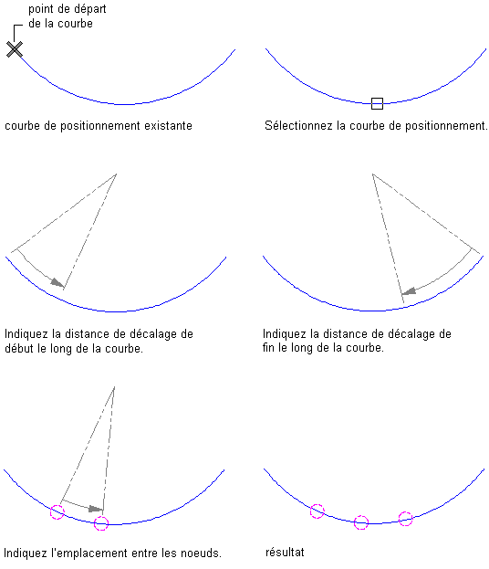 Placer des noeuds aux emplacements spécifiés appuyez sur la touche Entrée. Entrez le nombre de noeuds, puis indiquez l'emplacement de chacun d'eux en les sélectionnant ou en tapant la distance depuis le point de départ de la courbe.