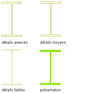 La géométrie des éléments de structure est créée par une forme incluse dans le style de l'élément de structure extrudé le long de l'axe de l'élément. Chaque forme peut être composée de différents niveaux de détail, ce qui permet d'obtenir différents types d'affichage de l'élément de structure qu'elle définit. Chaque élément de structure peut avoir plusieurs représentations d'affichage pratiquement semblables. Chaque représentation affiche la forme de structure dans un niveau de détail différent.