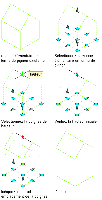 Cette procédure permet de modifier la hauteur de toit d'une masse élémentaire en forme de pignon à l'aide des poignées.