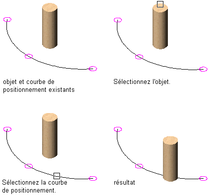L'objet est ancré à la courbe à la position X. Lorsque l'objet est placé pour la première fois, les positions Y et Z sont définies avec la valeur 0.