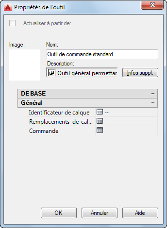 Par défaut, aucune image n'est associée à l'outil de commande. Vous pouvez ajouter une image pour illustrer la fonction de l'outil. Pour ce faire, cliquez avec le bouton droit de la souris dans la zone d'image vide, puis choisissez une image. |