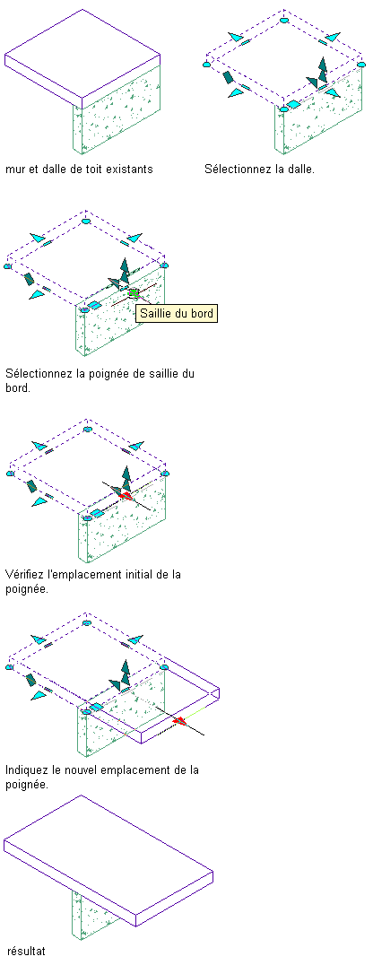 Cette procédure permet de modifier la saillie d'un bord de dalle ou dalle de toit. Vous pouvez également changer la saillie à l'aide de la fiche de travail disponible à partir de l'onglet contextuel sur le ruban ou de la palette de propriétés de l'objet.