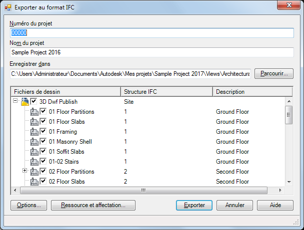 Les informations d'identification du projet, telles que le numéro et le nom du projet ainsi que les affectations de niveaux des Xréfs, s'affichent par défaut lorsque vous sélectionnez un dessin de projet à exporter.
