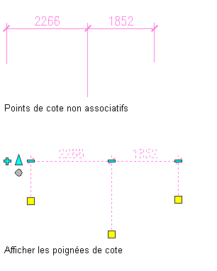 | coter les points non associatifs dans le dessin (crée une cote non associative) | vérifiez que la fonction ACCROBJ est désactivée. Tapez p (choisir des Points) sur la ligne de commande et spécifiez les points dans le dessin. |