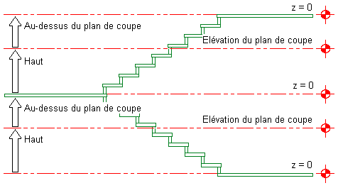 Cette procédure permet de spécifier l'affichage des composants d'escalier dans une vue en plan en fonction de leur occurrence au-dessus et au-dessous de l'élévation du plan de coupe. Pour chaque type de composant d'escalier, vous pouvez spécifier les propriétés des composants situés au-dessus et dans les parties supérieure et inférieure du plan de coupe.