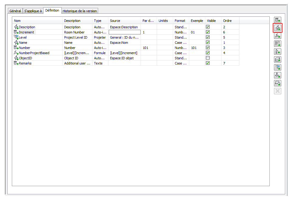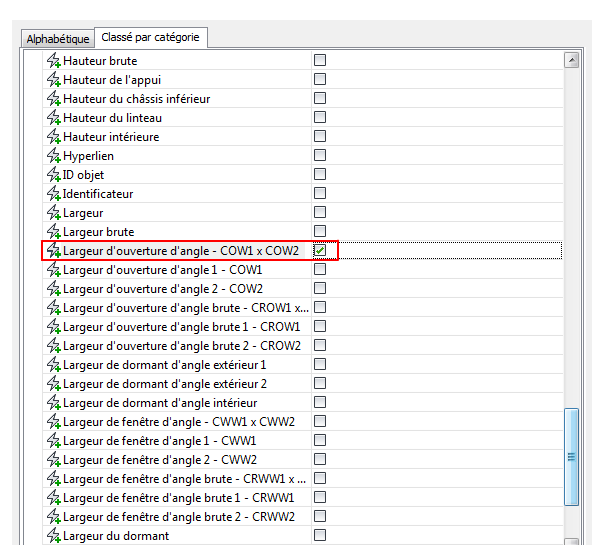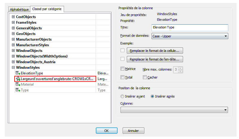 Pour modifier les propriétés automatiques générées dans la nomenclature de la fenêtre, effectuez les opérations suivantes :