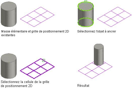 Remarque : Il n'existe aucune règle permettant de déterminer la cellule à laquelle l'objet s'attache lorsque vous effectuez l'ancrage. Vous pouvez activer le composant d'affichage Noeud afin d'afficher les noeuds de cellule de la grille ou du volume de positionnement ; la sélection des cellules sera ainsi facilitée. Vous pouvez également déplacer l'objet après l'avoir ancré à la grille ou au volume de positionnement.