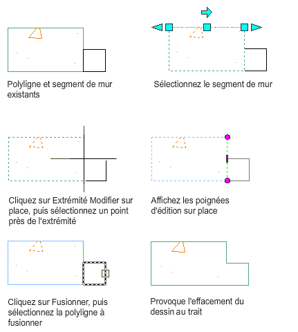 Cette procédure permet de modifier une extrémité de mur en fusionnant un profil avec un composant de mur. Un profil peut être n'importe quelle zone délimitée par une polyligne qui se superpose ou coïncide avec un composant spécifique.