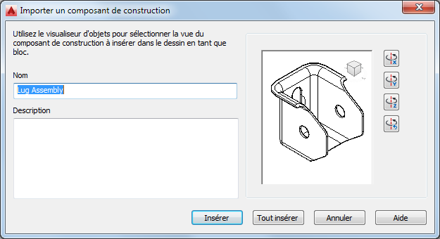 Cela provoque l'ouverture de la boîte de dialogue d'importation dans laquelle vous pouvez spécifier un nom, une description et changer l'orientation du bloc ou du bloc à vues multiples au moment de l'insertion.