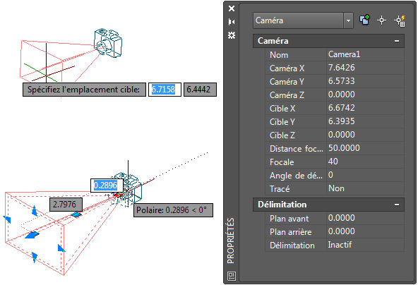 Vous pouvez modifier la distance focale d'une caméra, changer ses plans de délimitation avant et arrière, nommer une caméra et activer ou désactiver l'affichage de toutes les caméras dans un dessin.
