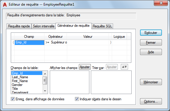 Affiche la liste des champs disponibles à partir de la table de base de données courante, dans laquelle vous pouvez choisir les champs à afficher dans la fenêtre Affichage des données lors de l'exécution de la requête. Si vous ne désignez pas les champs à afficher, la requête renvoie tous les champs de la table de base de données. Si vous cliquez deux fois sur un champ de cette liste ou sélectionner un champ, puis sur Ajouter (afficher les champs), vous ajoutez le champ à ceux affichés dans la fenêtre Affichage des données une fois la requête exécutée. Vous pouvez aussi faire glisser des champs dans les zones Afficher les champs et Trier par.