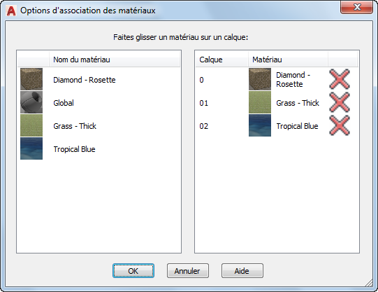 Répertorie tous les calques situés dans le dessin et dans les références externes attachées à ce dernier. La miniature du matériau affiche le matériau qui a été associé au calque. Cliquez sur le bouton Détacher (en forme de X) pour supprimer le matériau du calque.