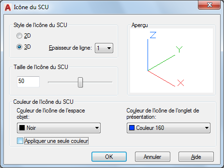 Spécifie l'affichage de l'icône SCU en 2D ou 3D, ainsi que son aspect.