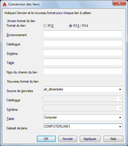 Les liens hérités étant stockés dans des formats très différents de celui d'AutoCAD 2000 et versions ultérieures, le processus de conversion des liens exige que vous établissiez un mappage entre les anciennes valeurs de lien AutoCAD SQL Extension ™ (ASE) et les nouvelles valeurs utilisées par AutoCAD 2000 et versions ultérieures. Par exemple, vous devez identifier l'environnement utilisé par un lien particulier dans la Release 14, et désigner la source de données devant remplacer cet environnement dans AutoCAD 2000 et version ultérieure. Vous devez établir des mappages entre les anciennes valeurs de lien ASE et celles qui doivent les remplacer.