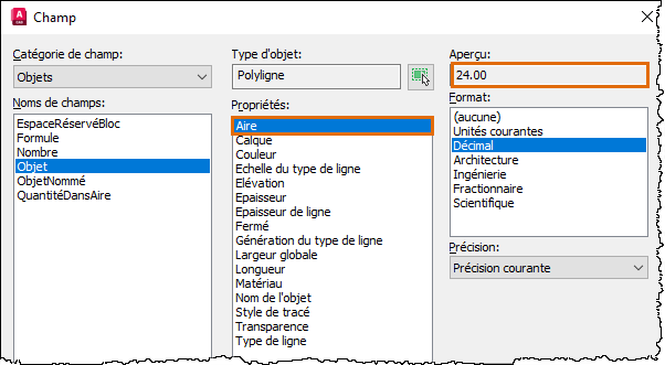 Les propriétés de l’objet sélectionné, y compris l’aire, s’affichent.