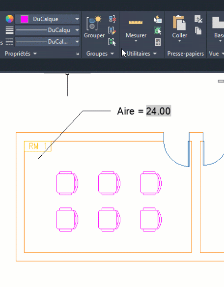 L’aire de la pièce sélectionnée s’affiche dans le texte de l’objet ligne de repère multiple.