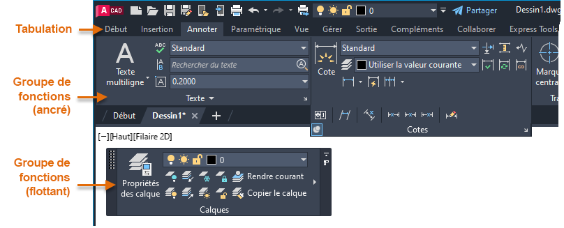 Les groupes de fonctions d'un onglet du ruban peuvent être définis comme étant flottants dans la fenêtre de l'application. Lorsqu'un groupe de fonctions du ruban est flottant, il est visible quel que soit l'onglet actif du ruban. Cela peut s'avérer très utile lorsque vous basculez fréquemment entre différents types d'outils. Par exemple, vous pouvez rendre flottants les groupes de fonctions Calques ou Propriétés, de sorte qu'ils soient visibles même lorsque les onglets Insérer ou Annoter sont actifs.