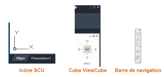 Le système de coordonnées utilisateur est utile dans certains dessins 2D, et il est essentiel pour la modélisation 3D. Si vous n'utilisez pas le SCU fréquemment, vous pouvez facilement le masquer. Il en est de même pour la commande ViewCube et la barre de navigation.