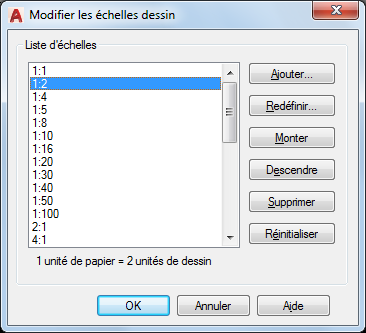 Affiche la liste des échelles actuellement définies. Affiche également des échelles temporaires qui sont importées au moment où des xréfs sont attachées. Si le nom d'une échelle est en double, mais que sa valeur est différente, un numéro est ajouté au nom.