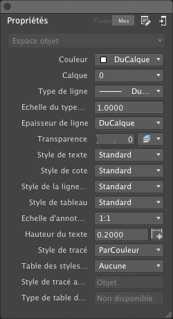 Affiche les propriétés pour le dessin courant ou les objets sélectionnés.