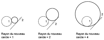 Le point de tangence est le point où deux objets se touchent sans se croiser. Pour créer un cercle tangent à d'autres objets, sélectionnez l'objet, puis spécifiez le rayon du cercle. Dans l'illustration ci-dessous, le cercle en gras est celui en cours de traçage, et les points 1 et 2 sont les points des objets auxquels le cercle est tangent.