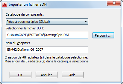Les données des radiateurs dans les fichiers BDH proviennent des fabricants de radiateurs et des applications de calcul des besoins en chauffage (comme SOLAR COMPUTER Desktop) et des logiciels de conception du marché de radiateurs D A CH. Les données d'un radiateur comprennent notamment sa longueur, sa largeur, sa hauteur, le nom de la société qui le fabrique et son nom de composant. Dans AutoCAD MEP toolset, vous importez un fichier BDH (.dat), puis vous créez les définitions de radiateurs dans le catalogue MvParts (DEU).apc. Vous pouvez utiliser les pièces à vues multiples pour modéliser la taille et la forme des composants utilisés dans la vie courante, comme les radiateurs. Dans AutoCAD MEP toolset, les pièces à vues multiples, telles que les radiateurs, sont classées par type et leurs données sont stockées dans des catalogues de composants. Un gabarit de radiateur par défaut contrôle le graphisme du radiateur. Ce gabarit se trouve dans \ProgramData\Autodesk\MEP <version>\fra\MEPContent\Global\MvParts\Plumbing\Radiators\Radiator Template_gbm.xml. Si vous souhaitez modifier l'aspect du radiateur, vous pouvez changer de gabarit. Reportez-vous à la rubrique Stockage et référence des composants de catalogue.