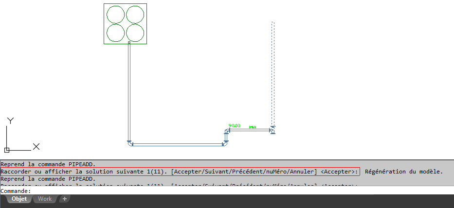 Conseil : Si le raccordement s'effectue par rapport à un objet d'un diamètre de tuyau différent ou correspondant à une autre préférence de routage, il est probable que vous soyez invité à choisir un composant à rattacher au deuxième objet.