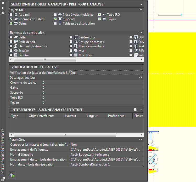 Remarque : Le mode d'analyse des interférences fonctionne indépendamment pour chaque dessin. Si vous accédez à un autre dessin, la palette de détection des interférences est mise à jour avec les informations du dessin actif.