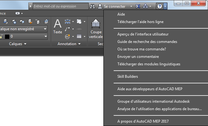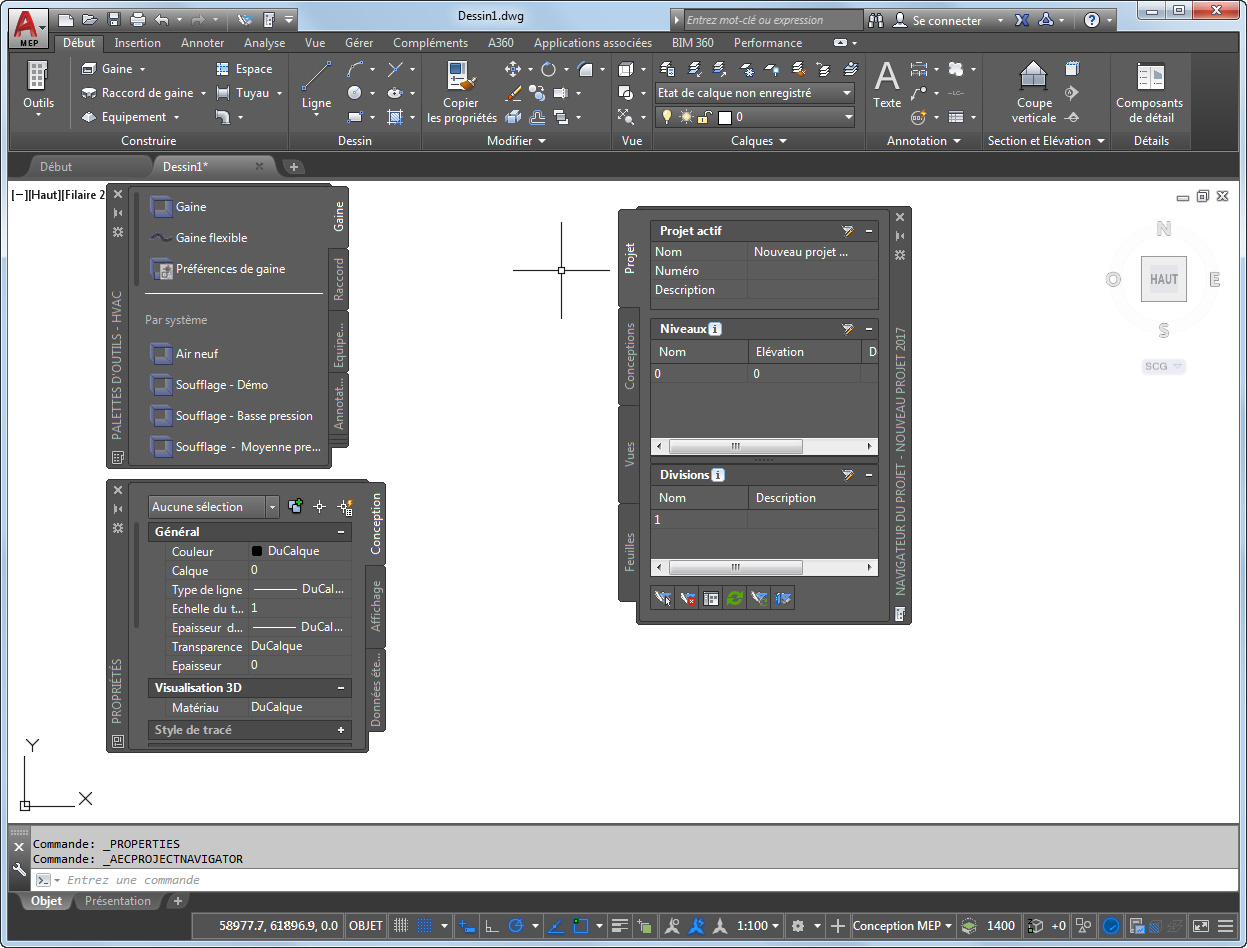 L'espace de travail comprend une fenêtre de dessin regroupant le ruban, les palettes d'outils et les autres commandes permettant de définir des projets MEP, de créer des conceptions et de générer des documents de construction.