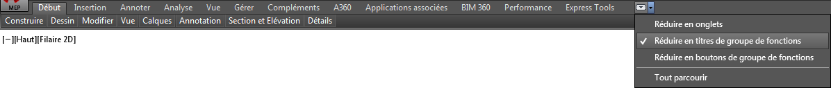 Pour n'afficher que les titres des groupes de fonctions dans les onglets du ruban, cliquez sur (Réduire en titres de groupe de fonctions) dans la partie supérieure droite du ruban.